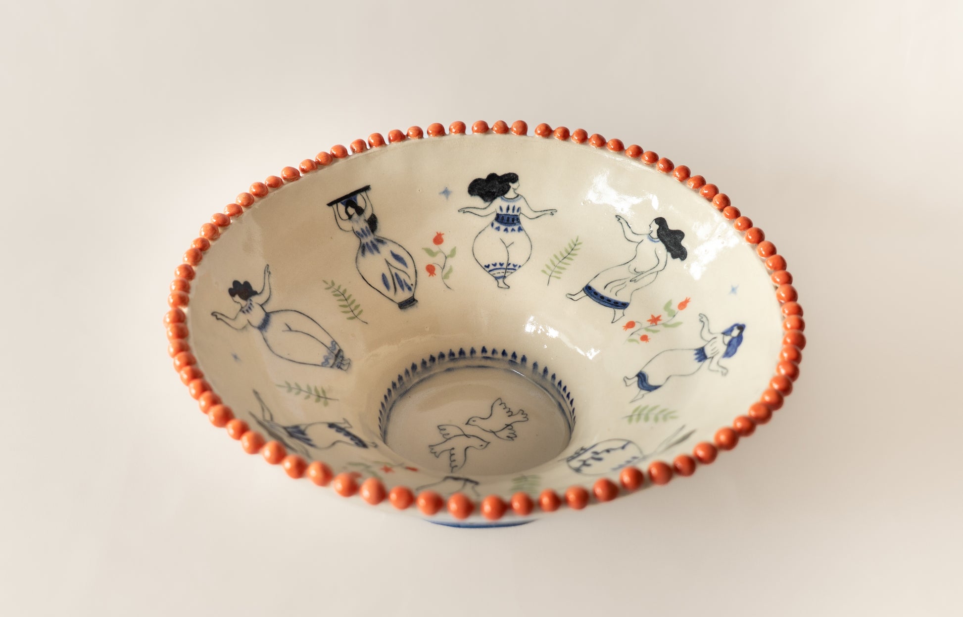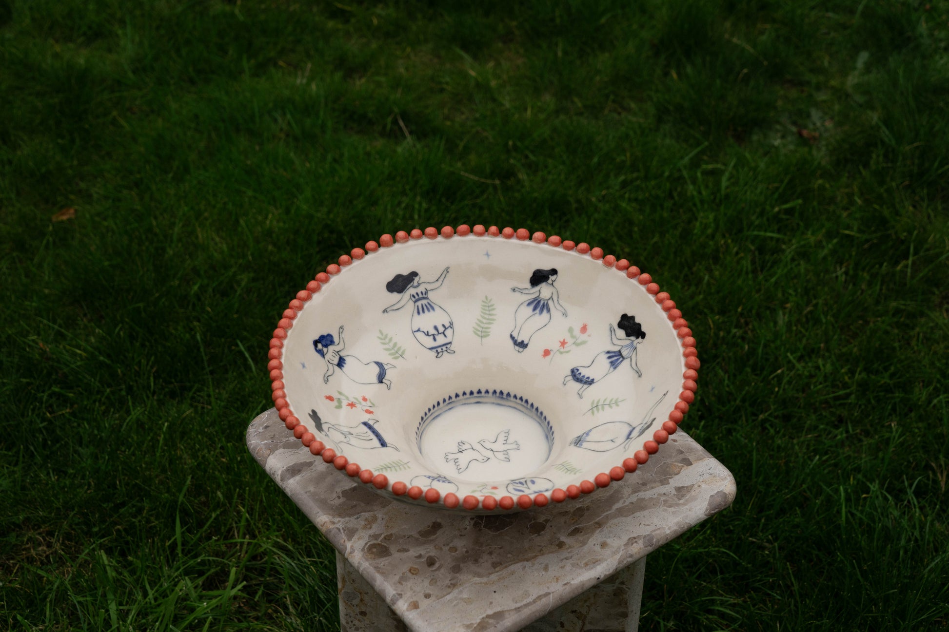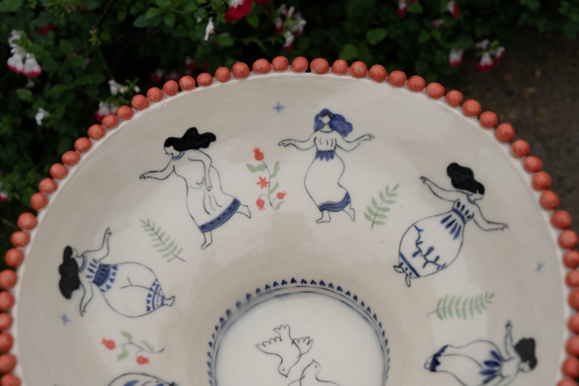 A hand-built stoneware centerpiece bowl featuring dancing women and a dove motif. A joyful tribute to togetherness, peace, and everyday rituals.
